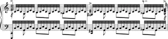 = 92. It is 131 measures long, the most of all six pieces,[14] but the second shortest in terms of playing time, usually no longer than three and a half minutes (the shortest is number four).[2] This piece represents a typical nineteenth-century étude, similar in style to Frédéric Chopin's Études (Opp. 10, 25), with a melody interspersed between rapid sextuplet figures.[2] It is in strict ternary form with a coda: identical beginning and ending sections beginning on measures 1 and 85, and a contrasting middle section starting on measure 45. The second section radically changes dynamics, constantly changing from piano to fortissimo and even sforzando.[14] It is, throughout, a relentless torrent of descending half steps and a cascading left hand figure reminiscent of Chopin's Revolutionary Étude (Op. 10, No. 12, 1831).[2] Ending the piece is a slow coda in Adagio (at ease) which closes with a plagal cadence in E♭ minor.[14]