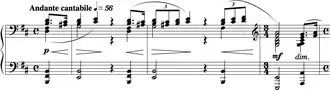 Andantino is the longest in the set by playing time (about eight and a half minutes).[2] It is described as a "generic hybrid", combining elements of the nocturne and theme and variation genres.[9] The melody is chromatic, syncopated, and long, all idiosyncratic elements Rachmaninoff often includes in his works.[2] Because of this, the Andantino is sometimes called an extension of his Nocturne in A minor of the Morceaux de Salon set (Op. 10, No. 1, 1894).[7] However, Andantino stands on its own with difficulties, such as the sections with multiple phrases in a single hand.[14]