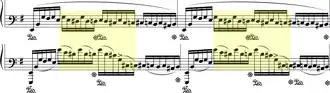 = 112.[14] At this point the piece develops a very thick texture, with the original left hand figure played in both hands in varying registers. The technique of rapidly changing the octave in which a melody is played, sometimes called "registral displacement", is used to present the figure in a more dramatic form that increases the intensity of the ending.[9] The ending, a coda in Prestissimo (very quick),