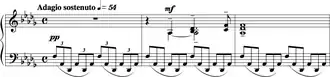 4) with a typical nocturne figure for the left hand.[14] A mid-piece pause at roughly the same area in Schubert's first Moments musicaux further emphasizes the influence of Schubert.[9] The second part is marked con moto (with motion), at