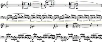 Like the second and fourth pieces, number six is written in the form of an étude, with a repetitive but technically challenging chordal melody that is doubled in both hands.[2] In all, the work has three distinct elements played simultaneously: the main melody, the continuous thirty-second note broken chord figures, and a descending eighth note motif.[14] Dynamics play a large part in this piece: the fortissimo marked at the beginning is maintained all throughout the first section, with only brief respites to mezzo forte.[14] The middle section is wholly softer, and contains two areas with significant mounting tension, creating the aforementioned "apotheosis effect" with dramatic "false starts."[9] Here, the theme is manipulated contrapuntally to develop a canonic effect. This "triple counterpoint... is titanic both in size and impact, and in potential for disaster,"[9] referring to the tension, waiting for the final climax, in this "continuing explosion."[1] Immediately before the coda, the thick texture and canon suddenly disappear and the piece becomes piano. Upon entering the coda, the work resumes the forte theme and amalgamates to a majestic ending played fortississimo.[14]
