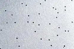 The telescope's imaging camera is made up of 30 CCD chips, each with a resolution of 2048 × 2048 pixels, totaling approximately 120 megapixels.[11] The chips are arranged in 5 rows of 6 chips. Each row has a different optical filter with average wavelengths of 355.1 (u), 468.6 (g), 616.5 (r), 748.1 (i), and 893.1 (z) nm, with 95% completeness in typical seeing to magnitudes of 22.0, 22.2, 22.2, 21.3, and 20.5, for u, g, r, i, z respectively.[12] The filters are placed on the camera in the order r, i, u, z, g. To reduce noise, the camera is cooled to 190 kelvins (about −80 °C) by liquid nitrogen.