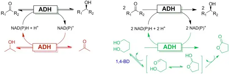 Comparison of the use of isopropanol (left) to the "smart cosubstrate" approach using 1,4-butanediol. The lactone coproduct makes the regeneration reaction irreversible