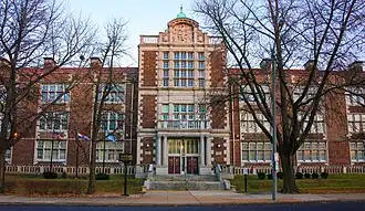 Also part of the court desegregation plan was the physical improvement of city schools.[14] Significant renovations to Soldan began in late 1989 and included interior renovations and the replacement of the school's two 2,000-square-foot gymnasiums with one 10,000-square-foot gymnasium.[14] Due to the renovations, the building was closed from the 1990–1991 to the 1992–1993 school years, and its students were reassigned to Roosevelt High School.[15][16] While the building was undergoing renovations, the city's Center for Management, Law and Public Policy magnet school was folded into the international studies program at Soldan.[17] After three years of construction, the renovated building reopened on September 2, 1993.[18] However, an electrical rewiring of the school and the installation of a synchronized clock system, which were to be completed as part of the renovation work, were not finished until early 1995 owing to a contractual dispute with an electrical company.[19]