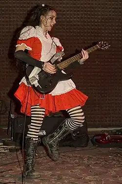 With a discography of 11 full-length albums under its belt,[5] (six One-Eyed Doll albums, four Kimberly Freeman solo albums and one under the name Ghetto Princess) the band made No. 1 on ReverbNation's local chart[6] and has toured nationally with OTEP[7][8] Cold, Wayne Static (of Static X), Peelander Z, Polkadot Cadaver, Wednesday 13, Mushroomhead, and Orgy. The band's lead singer and guitarist, Freeman (who has been described as Gwar meets Strawberry Shortcake)[9] performs on a signature Tregan guitar, accompanied by the lone drummer (and producer) Jason Rufuss Sewell a.k.a. Junior, in a theatrical style[10] which has been described musically as "... Pixies meets Siouxsie meets Hole"[11] and the "bastard laboratory love child of Dresden Dolls meets White Stripes and Marilyn Manson."[12] Lead vocalist Kimberly Freeman was featured as one of Revolver Magazine's Hottest Chicks in Hard Rock in 2011, 2012, and 2015, Guitar Player Magazine's Top 20 Most Extraordinary Guitarists and on America's Got Talent's 2010 Semi-Finals as part of ArcAttack.
