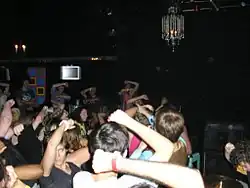 A member of Soophie ridicules an audience member for not "doing the cinderblock", while other audience members (who are "doing the cinderblock") look on.