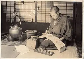 The Japanese abacus has been taught in school for over 500 years, deeply rooted in the value of learning the fundamentals as a form of art.[3] However, the introduction of the West during the Meiji period and then again after World War II has gradually altered the Japanese education system. Now, the strive is for speed and turning out deliverables rather than understanding the subtle intricacies of the concepts behind the product. Calculators have since replaced sorobans, and elementary schools are no longer required to teach students how to use the soroban, though some do so by choice. The growing popularity of calculators within the context of Japanese modernization has driven the study of soroban from public schools to private after school classrooms. Where once it was an institutionally required subject in school for children grades 2 to 6, current laws have made keeping this art form and perspective on math practiced amongst the younger generations more lenient.[4] Today, it shifted from a given to a game where one can take The Japanese Chamber of Commerce and Industry's examination in order to obtain a certificate and license.[5]