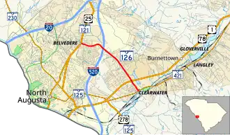 South Carolina Highway 126 (SC 126) is a 4.200-mile (6.759 km) primary state highway in the U.S. state of South Carolina. It directly links Belvedere with Clearwater, with a small portion in North Augusta.
