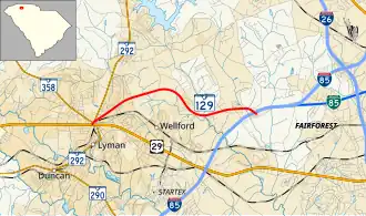 South Carolina Highway 129 (SC 129) is a 4.970-mile (7.998 km) state highway in the U.S. state of South Carolina. It connects Falling Creek Road near Spartanburg with U.S. Route 29 (US 29) and SC 292 in Lyman. It also has an interchange with Interstate 85 (I-85) just north of its southern terminus. The highway is known as Fort Prince Boulevard.
