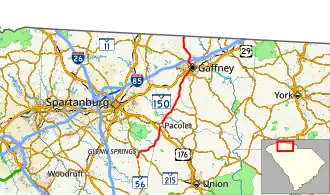 SC 150 was established in 1940 as a renumbering of part of SC 103, from SC 18 in Gaffney to the North Carolina state line.[4] In 1960-61, SC 150 was extended south to its current southern terminus at SC 56, replacing part of SC 18.[5][6]