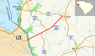 SC 181 begins at the Georgia state line at a point southwest of Starr, within Anderson County, where the roadway crosses over the Savannah River and continues as Georgia State Route 181 (Smith-McGee Highway). It travels to the northeast and has a brief concurrency with SC 187. The highway continues to the northeast and enters Starr. There, it meets its northern terminus, an intersection with SC 412 (Rainey Road/Stones Throw Avenue). Here, the roadway continues as Smith-McGee Road.[2]