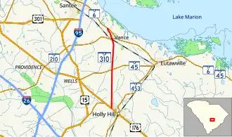 SC 310 begins at an intersection with US 176/SC 453 Truck in Holly Hill. The highway heads north concurrently with SC 453 Truck to a roundabout with SC 45, north of the city. Here, the truck route follows SC 45, while SC 310 continues to the north. It enters the city of Vance, where it intersects SC 210. After leaving Vance, SC 310 heads northwest and meets its northern terminus, an intersection with SC 6, just northwest of the city.[2]