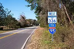 SC 336 is a two-lane rural highway predominantly throughout its route. Starting at US 321 in Tillman, it goes east into downtown Ridgeland, then continuing east to SC 462 in Old House where it ends. Its routing east of Interstate 95 (I-95) takes a series of turns, making the highway's routing a bit disjointing.[2] Travelers wishing to bypass Ridgeland can continue straight on Smiths Crossing (S-27-29), saving a 0.5 miles (0.80 km) and a few minutes, though large trucks are restricted from using that route.
