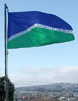 Vexillologist James Dignan[27] proposed a flag including the Southern Cross stars that appear on the New Zealand national flag, with a depiction of the Southern Alps (the white peak) and the forests and fields of the south (the green inset). The Southern Alps are the South Island's most prominent geological feature, and agriculture and forestry the main primary industries, making this concept an appropriate representation.[28]