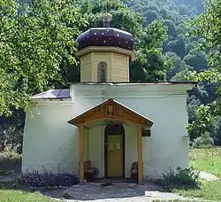 The South Zelenchuksky Church dates back to the late 10th or early 11th century, and is one of three cross-in-square churches known to have been built in the Alanian Diocese, the other two being the North Zelenchuksky Church and the Shoana Church. Unlike the other two churches, the South Zelenchuksky Church is a simple cross-domed church without beams. The church was renovated at the end of the 19th century, during which a cornice was added under the dome, the walls were plastered, the frescoes were painted over,[2] the slab flooring was replaced with wooden flooring,[3] and the drum was covered in a wooden facade. Additionally, because the church's original doorway was plastered over, a new doorway was built into the church's northern wall. After the renovation, the building was consecrated as a church of the Alexander-Athos monastery.[4] Because of the renovation, the church is now one of the most studied cross-domed churches in Alanya.