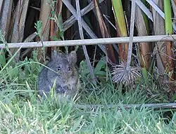 Their young are precocial at birth and are relatively large compared to other similar sized rodents.[3][9] They are covered with fur and their incisors erupted, which allows them to cling to their mother's nipples as she travels for their first two weeks after birth. By day 2, their eyes are open, they can hear acutely, and can eat solid food.[9] They will eat both their own and others feces to obtain enough nutrients.[3] By day 5, they have coordinated body movement. Approximately by day 13, weaning is complete.[9] They grow rapidly, reaching 71% of adult mass by the time they are 10 weeks old. Females are sexually mature at 9–10 weeks old, but males mature later. They have a lifespan of up to 2 years.[3]