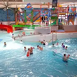 - Wave pool begins wide and shallow (much like a beach) progressively deepening into a regular swimming pool halved in width is the box-shaped "deep end" (No diving).[2]