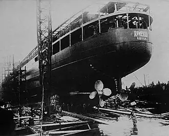Armenia, built in 1928 at Baltic Shipyards in Leningrad (now St. Petersburg), was one of four Adzharistan-class passenger liners specifically designed for use on the Black Sea. They were the first passenger ships to be built in the newly formed Soviet Union.[1] Armenia was a mid-sized vessel capable of carrying 1,000 tons of cargo as well as about 550 passengers in first-, second-, and third-class accommodations. On short trips it could carry 400–500 more on deck.[1] Her draft of 5.5 meters allowed access to the shallow-water ports of the Crimean Peninsula. Throughout the 1930s she and her sister ships – Gruzia, Adzharistan, Abkhazia, Krim and Ukraina – reliably ferried passengers, mail, and cargo between Black Sea ports such as Odessa, Mariupol, Sevastopol, Yalta, and Batum.