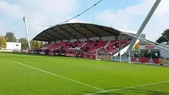 The main stand has a bent canopy hanging off two leaning pillars. Van Zuik received the National Steel Price, in the category of "characteristic steel components".[9] Since 6 June 2009, the main stands at De Toekomst are named after the deceased Bobby Haarms, a former coach and honorary member of the club.[10]