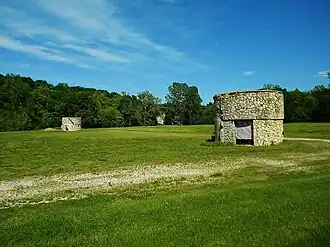 St. Albans Farms Stone Barn, also known as the Stone Dairy Barn, is a historic barn located at St. Albans, Franklin County, Missouri. It was built about 1918, and is a large U-shaped one-story frame building with limestone-faced walls and a steep gable roof. It features round corner towers that are topped with conical roofs. Associated with the barn are a large round tile silo off of each back corner.[2]: 6  Much of the barn has been demolished.
