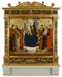 It represents the Madonna and Child surrounded by six saints including St. Luke, the physician (with an ox), St. Bartholomew (with the knife used to flay him), St. Lawrence, the Deacon (with the grill on which he was martyred and a palm signifying a martyr's victory), St. John the Baptist (who in the painting is depicted proclaiming “Ecce Agnus Dei,” “Behold the Lamb of God”), St. Martin, 4th century Bishop of Tours, and St. Sebastian, Roman martyr put to death by arrows. This subject, common in Renaissance art, is known as a sacra conversazione, a “holy conversation,” as saints of many different times and places are imagined in “conversation” with Mary and Jesus. The painting underwent a major restoration in 2005 at the Seattle Art Museum, where it was featured as the centerpiece of an exhibit on devotional art of the Renaissance.[19] The original provenance of the painting, and how it came to St. James cathedral, is unknown, although it once hung in the cathedral's baptistery (now the Reconciliation Chapel) until it was moved to the cathedral chapel in 1950.