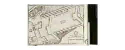 At the beginning of the Cretan War, the city of Šibenik was in dire need of additional fortifications. The citizens had been dreading the possibility of enemy attack from the hills above the city and pleading with the Venetian senate for their fortification since the 1520s.[3] In the spring of 1646, a Genoese engineer in the Venetian service, Father Antonio Leni, designed a simple symmetric fort with its front hornwork elongated towards the enemy and two flanking demi-bastions on the side towards the city.[4] Although the Venetian war council did not allocate funds for the construction, they also did not forbid the citizens to build the fortress themselves.[5] And so, according to Leni's plan, the development began. The groundwork was done on 1 August 1646, and the whole fortress was completed in just 58 days.[6] Although built in haste and lacking certain elements, St. John's Fortress played a key role in city's defense against the Ottomans in October 1646[7] and especially during the month-long siege in August and September 1647,[8] when around 7,000 defenders managed to repel 25,000 Ottoman soldiers who had already conquered parts of the fortress.