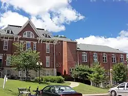 The Classroom/Gymnasium addition was added onto St. Mary's Hall from 1902 to 1903. It is a three-story brick structure that follows a largely rectangular plan and it is capped by a hipped roof. The lower half of the wall buttresses are faced with concrete. This addition is much plainer than the rest of the facility and it suggests the move from the picturesque forms of the late 19th century to a more utilitarian form.[2] The triangular-headed windows suggest the Gothic Revival style. Large brick wall buttresses divide the length of the building into five bays. The gymnasium was located on the third floor and is indicated on the exterior by the tall windows. A two-story addition was built later onto the north side.