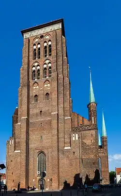 St. Mary's Church (Polish: Bazylika Mariacka, German: St. Marienkirche)[a] is a Roman Catholic church and co-cathedral located in central Gdańsk, Poland. Completed in 1502 in the Brick Gothic architectural style, it is one of the world's largest brick churches and among the city's most important landmarks, known to its inhabitants as the Crown of Gdańsk (Polish: Korona Gdańska). Together with Oliwa Cathedral, it serves the Archdiocese of Gdańsk.