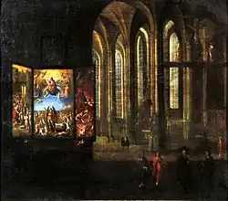 In 1861–64 a Sexton named Hinz systematically searched chests, cabinets and other storages in chambers and rooms, also in the tower, and found many more historic liturgical garments.[6] In the 1870s and 1880s the congregation sold more than 200 incomplete pieces, but also intact altar cloths and embroideries to the Berlin Museum of Decorative Arts.[12] The remaining pieces of the garment collection, the so-called Danziger Paramentenschatz (Danzig Parament Treasure),[14] mostly originate from the 150 years between 1350 and 1500.[15]
