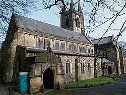 The church is constructed in sandstone with Yorkshire stone dressings and is roofed in green Cumberland slate. Its architectural style is Perpendicular.[2] The plan consists of a nave and chancel in one range, north and south aisles, a south transept, and a north transept above which rises a tower. A clerestory rises above the aisles along the length of the nave, to the south of the chancel is a chapel, and to its north is a vestry. There is a porch in the westernmost bay of the south aisle, and another porch in the angle of the south transept.[2][6] On each side of the clerestory are ten square-headed two-light windows. The west window has five lights and contains intersecting tracery. Along the aisles are buttresses and two-light windows. The south transept also has buttresses, and a large five-light window containing Perpendicular and curvilinear tracery. The chancel has a large east window with six lights containing Perpendicular tracery. The tower has diagonal corner buttresses that rise to octagonal turrets surmounted by crocketed pinnacles. The summit of the tower has an embattled parapet.[2]