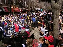 By the 2000s, the event's size grew significantly and largely culminated in rioting resulting in vandalism, theft, property damage, arson, and assault; resulting in hundreds of arrests costing the city thousands of dollars.[12] By 2003, the event became a point of contention in local government and was costing the city over $700,000. The cost of additional police, the potential of damage to local businesses, and the protection of the city's reputation prompted the concern of Madison leaders, some of whom suggested canceling the event altogether. In 2005, riot police used tear gas to disperse the riotous crowd of 100,000 and over 400 arrests occurred.[13]