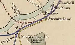 The first station, opened by the West End of London and Crystal Palace Railway, was on the line between Pimlico and New Wandsworth stations, located just south of the bridge under the LSWR lines.[1] It was opened on 29 Mar 1858[2][3] and closed on 1 December 1858.[2][4]