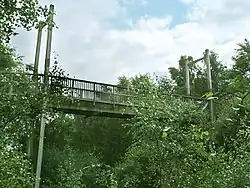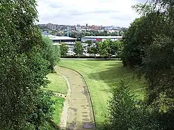 2005 view from the middle of the suspension bridge, looking out over the eastern edge of the retained garden parkland. Beyond, the new out-of-town retail park merges into Stoke-on-Trent's city-centre.