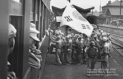 The students individually supported the local enlistment and served as soldiers of the Armed Forces. A number of female students were also appointed as nurses.[7] The student soldiers went down to Daegu and were once again organized into 10 divisions of the armed forces and their subordinate units.[8] The student soldiers made great achievements in the Nakdong River Defense Line, which was considered as the last fortress.[9] About 700 of them were transferred to UN troops in Busan in mid-July. After graduating, they went to Japan and went on a regular operation in Incheon Landing Operation on September 15.[10] In addition, the 22nd and 26th Regiments of the 3rd Infantry Division of the ROK Army, and the 15th Regiment of the 1st Infantry Division of the ROK Army filled the majority of the recruits with the student soldiers from the middle of July.[11] At the beginning of August, the newly formed 25th of June cohort, in Daegu also filled most of the troop vacancies with student soldiers.