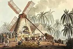 The island of Saint Croix has long been associated with sugar production and has been the dominant cash crop for the economy for over two hundred years.[1] Due to its considerable accomplishments in agriculture, the island of Saint Croix became one of the wealthiest sugar producing islands and gained a reputation as "The Garden of the West Indies".[2][3] The Caribbean island of Saint Croix in the United States Virgin Islands was a major sugar producing area from at least 1734 when the Danish West India and Guinea Company bought the islands from the French. The Danish colonists exploited the island, including the area around Belvedere on the north coast of the island from 1763.[4] There is a historic sugar plantation located at Belvedere and sugar mill which was built by the Danish.[5] When the Danes arrived on Saint Croix they found a number of British families raising cane and making rum. The Danes divided the islands into 150 and 300 acre plantations and into nine quarters but faced stiff competition from the British who at one point owned five times as many plantations as the Danish.[6] Due to extremely low land costs and tax benefits, planters came to Saint Croix from the surrounding islands of St. Thomas, Tortola, Virgin Gorda, Montserrat and elsewhere and by 1755 the island had a population of over 10,000.[6] Although the Danes almost went bankrupt in 1753, they steadily grew to dominate Saint Croix, operating 375 plantations not only cultivating sugar, but also cotton, indigo and tobacco. The sugar industry reached its peak between 1795 and 1800 after the Danes declared the slave trade in 1792 which ensured a plentiful supply of African labor, coinciding with high prices on the world market.[1] At the peak of output in sugar production in the Virgin Islands at the close of the 18th century, more than 30,000 acres of Saint Croix were under sugar cultivation.[1] The island of St. Croix contained nearly 150 sugar mills during this period; 115 of which are still standing today.[7]