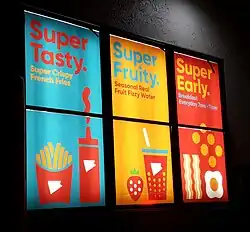 SuperDeluxe serves burgers, chicken nuggets, French fries, and milkshakes. Burgers are served with American cheese, onions, pickles, and shredded lettuce. The breakfast menu includes tot hash browns. The drink menu offers coffee (including almond milk lattes and mochas), using Stumptown Coffee Roasters. Milkshake flavors include blackberry, chocolate, coffee, strawberry, and vanilla.[1]