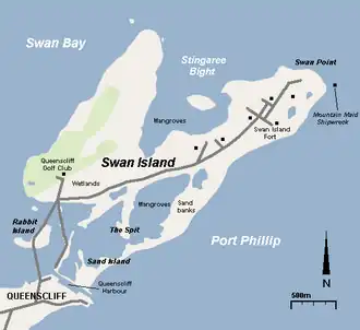 Swan Island (Wathaurong: Woorang-a'look)[1] is a 1.4 km2 sand barrier island which, with Duck Island and the Edwards Point spit, separate Swan Bay from Port Phillip in Victoria, Australia. It lies close to and north of the town of Queenscliff at the eastern end of the Bellarine Peninsula, and is an official bounded locality of the Borough of Queenscliffe.
