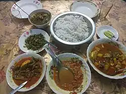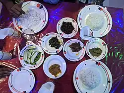 The Chittagong Hill Tracts are home to tribes with their own culture and cuisine.[38][39] Chakma cuisine uses sidol, a paste made from fermented shrimps and fish, and suguni, dried shrimp or fish.[40] Their dishes use more herbs from the hills more than the spices common in Bengali dishes.[40] Important seasonal ingredients include wild mushrooms and the Flowers of ginger and turmeric plants.[40] Sumoh gorang is a dish cooked in bamboo and Hebaang is baked in banana leaves in a mud oven.[40] Marma cuisine uses a paste of dried fish called nappi.[4] Rice beer is a popular drink.[4]