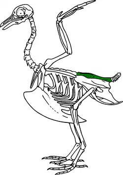 The synsacrum is a skeletal structure of birds[1] and other dinosaurs,[2] pterosaurs,[3] as well as xenarthran mammals,[4] in which the sacrum is extended by incorporation of additional fused or partially fused caudal or lumbar vertebrae. Some posterior thoracic vertebrae, the lumbar, sacral and a few anterior caudal vertebrae are fused to form a complex bone called synsacrum. In birds, inate bones are fused with the synsacrum to a greater or lesser extent, according to species, forming an avian pelvis. This forms a more extensive rigid structure than the pelvis of a mammal, fulfilling requirements for flight, locomotion and respiration. Posterior to the bird synsacrum there are a few free caudal vertebrae, the last of which is the pygostyle to which the long, stiff tail feathers are attached. The central section of the synsacrum is swollen to accommodate the glycogen body, an organ whose function is as yet unclear but which may be associated with balance. [1]