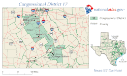 Texas's 17th congressional district of the United States House of Representatives includes a strip of Central Texas and Deep East Texas stretching from Nacogdoches to Waco and Round Rock, including former President George W. Bush's McLennan County ranch.[5][6] The district is currently represented by Republican Pete Sessions.