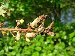 Taphrina padi is a fungal plant pathogen that induces the form of pocket plum gall that occurs on bird cherry (Prunus padus). The gall is a chemically induced distortion of the fruits, which are swollen, hollow, curved and greatly elongated,[1] without a seed or stone, but retaining the style.[2] The twigs on infected plants may also be deformed with small strap-shaped leaves.[1]