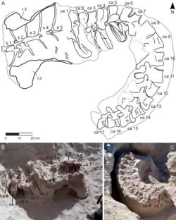 The first known elements of the holotype were discovered in the Aïn el Guettar Formation in 2011 by Aldo Luigi Bacchetta, but he was unable to excavate the specimen until 2012. The remains were subsequently studied by Federico Fanti, Andrea Cau, Mohsen Hassine and Michela Contessi. The genus was named in 2013. The name refers to the Tataouine Governatorate, Tunisia, and Hannibal.[2] In 2015 more material of the holotype specimen was uncovered after the initial description were analysed.[3] These included additional tail vertebrae.