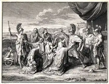 Coriolanus initially met his mother, wife, and sons in private, but Veturia insisted on addressing him in front of the troops.[9] Once they had an audience, Veturia gave a long, passionate speech begging him to end his advance and lay down his arms. Volumnia and his sons did not join in the speech, but they wept and knelt by Volumnia while the other women surrounded them in support.[10] Eventually, Coriolanus agreed to his mother's demands and surrendered.[11]