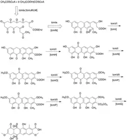 As in other anthracycline antibiotics, the framework is synthesized by a polyketide synthase and subsequently modified by other enzymes. Early studies of tetracenomycin C biosynthesis utilized mutants that were blocked in its production to describe many of the pathway's intermediates.[4]