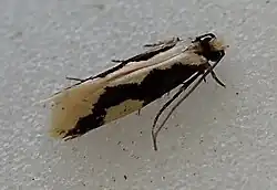 The wingspan is 18โ19 mm. The forewings are elongate and dark purplish-fuscous with whitish-ochreous markings. The hindwings are grey.[4]