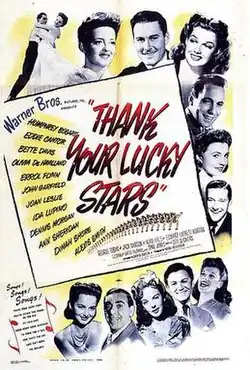 Thank Your Lucky Stars is a 1943 American musical comedy film made by Warner Bros. as a World War II fundraiser, with a slim plot involving theater producers. The stars donated their salaries to the Hollywood Canteen, which was founded by John Garfield and Bette Davis, who appear in this film.[3][4] It was directed by David Butler and stars Eddie Cantor, Dennis Morgan, Joan Leslie, Edward Everett Horton and S.Z. Sakall.[5][6]