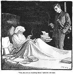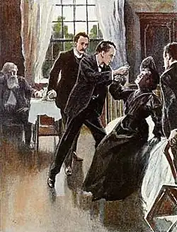 ![]() Holmes asking about a mark on the bureau, 1904 illustration by Sidney Paget | |||