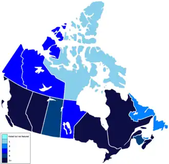 | 1 | Alberta | 11 (1, 2, 3, 4, 5, 6, 7, 8, 9, 10, 11) | 123 |