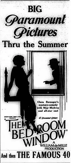 The Bedroom Window is a 1924 American silent mystery film directed by William C. deMille and starring May McAvoy. It was produced by Famous Players–Lasky and distributed through Paramount Pictures.[1][2]
