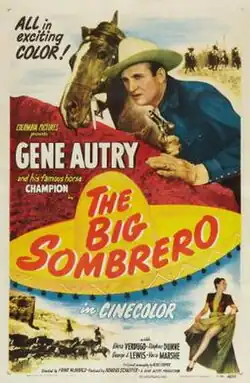 The Big Sombrero is a 1949 American Western film directed by Frank McDonald and starring Gene Autry and Champion. Written by Olive Cooper, the film is about a singing cowboy hired as foreman of the Big Sombrero ranch by a man working against the interests of the ranch's absentee owner and workers.[1] It was the last of two Autry Columbia films shot in Cinecolor, it was preceded by The Strawberry Roan.